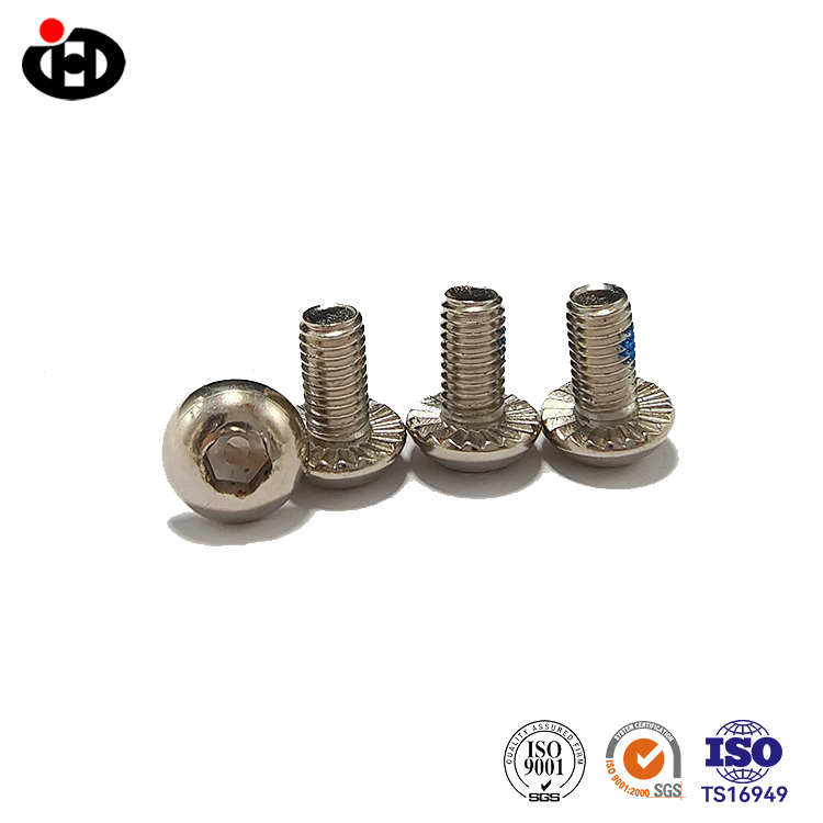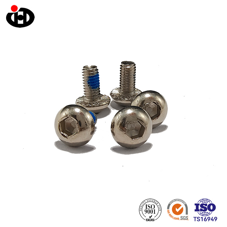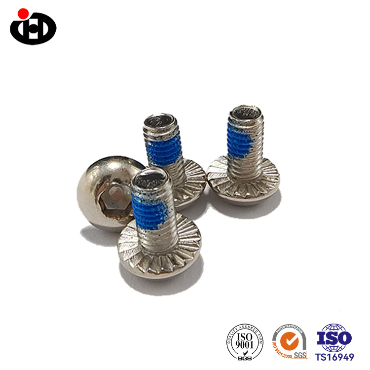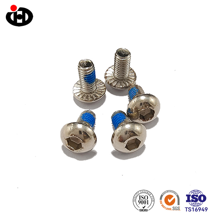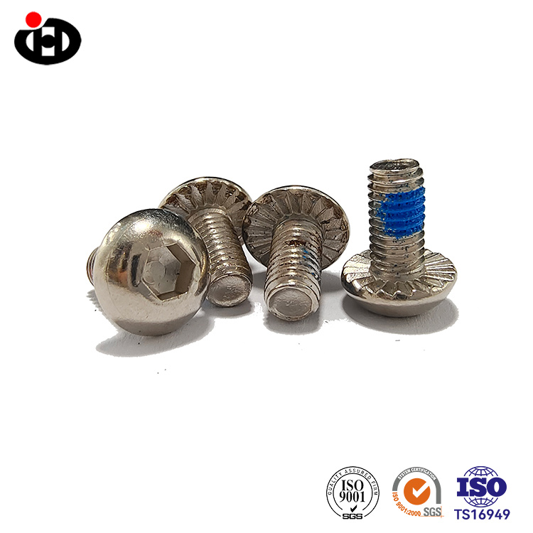 Śruby z głowicą nylokiej mają precyzyjny obrabiany okrągły wzór zęba na dole półkolistej głowicy, która tworzy fizyczną strukturę blokującą po instalacji w celu odporności na boczne siły ścinania. Przyjmuje importowaną technologię powlekania anty kropli, a warstwa kleju wnika do mikro szczeliny nici pod siłą przed dokręceniem, tworząc twardą warstwę wiązania po utwardzaniu w celu odporności na wibracje osiowe. Głębokość wewnętrznego rowka sześciokątnego jest zoptymalizowana, aby zapewnić, że narzędzie dobrze pasuje do głowicy śrubowej.